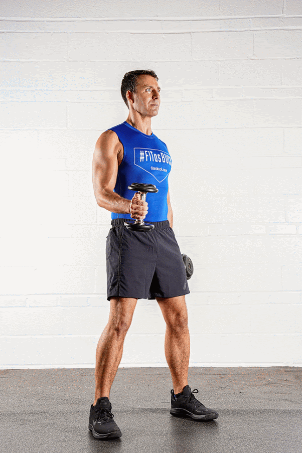 - The outside of DB should end up parallel to front of shoulder, the tip of your elbow pointing toward the floor.
